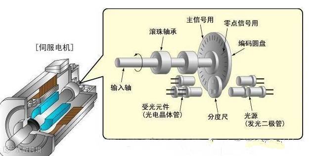 由一个中心有轴的光电码盘,其上有环形通、暗的刻线,有光电发射和接收器件读取,获得四组正弦波信号组合成A、B、C、D,每个正弦波相差90度相位差(相对于一个周波为360度),将C、D信号反向,叠加在A、B两相上,可增强稳定信号;另每转输出一个Z相脉冲以代表零位参考位。