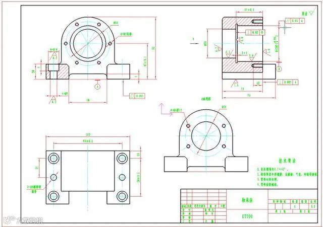 1、我们先要了解这个轴承座的装配位置和功能要求,这个轴承座是用来固定和支撑丝杆的,而丝杆是设备的一套传动系统中的主要组成部分,这个部分决定设备传动系统的可靠性和传动精度,所以这个部位的安装是一个关键性的安装。再来看这个轴承座的安装要求,主要的装配结构是丝杆装在轴承上,轴承装在轴承座里面,轴承座装在支承大件上,那就意味着,轴承孔可轴承座的固定面(与支承大件的结合面)是需要有较高的加工精度要求才能保证我们最后的丝杆传动系统的装配精度,所以我们就针对轴承孔和固定面来标注行为公差。