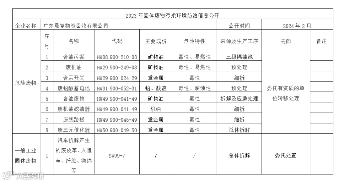 广东晟复物资回收有限公司2023年危险废物污染防治信息公开