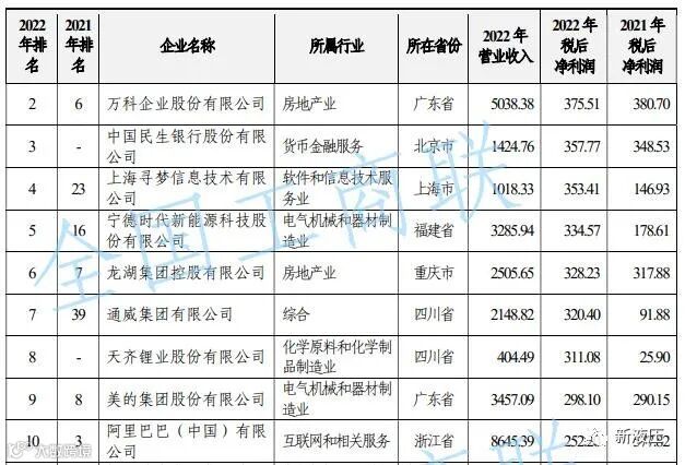 其中,税后净利润超百亿元的有30家,超过200亿元的企业为腾讯、万科、民生银行、上海寻梦信息技术有限公司(拼多多的运营公司)、宁德时代、龙湖集团、通威集团、天齐锂业、美的集团、阿里巴巴、特变电工、格力电器、赣锋锂业、内蒙古汇能煤电集团有限公司等14家企业。