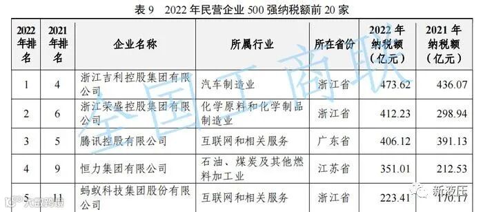 纳税方面,2022年,民营企业500强纳税总额达1.25万亿元,占全国税收总额的7.51%。纳税额超过400亿元的企业共3家,分别为吉利控股(473.62亿元)、荣盛控股(412.23亿元)、腾讯(406.12亿元)。