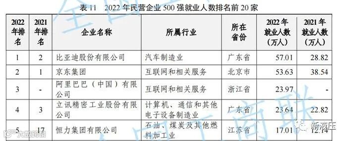 就业方面,2022年,民营企业500强就业总数为1097.21万人,占全国就业人员的1.50%。其中,比亚迪就业人数位居榜首,达57.01万人。