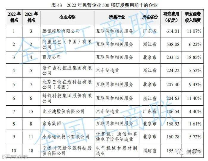2022年,民营企业500强中,研发人员占员工总数超过3%的企业326家,超过10%的企业175家。研发经费投入强度超过3%的企业86家,超过10%的企业8家。腾讯以614.01亿元的研发投入位居首位。