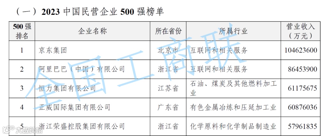 2023年9月12日,全国工商联发布“2023中国民营企业500强”榜单和《2023中国民营企业500强调研分析报告》。京东集团、阿里巴巴、恒力集团位居榜单前三位。