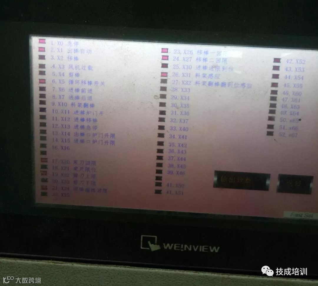 开始检查,先到控制电箱按移棒按钮开关,同时查看触摸屏输入页面,这写的什么玩意啊?按移棒按钮显示 X3 风机过载,货不对板没法看;