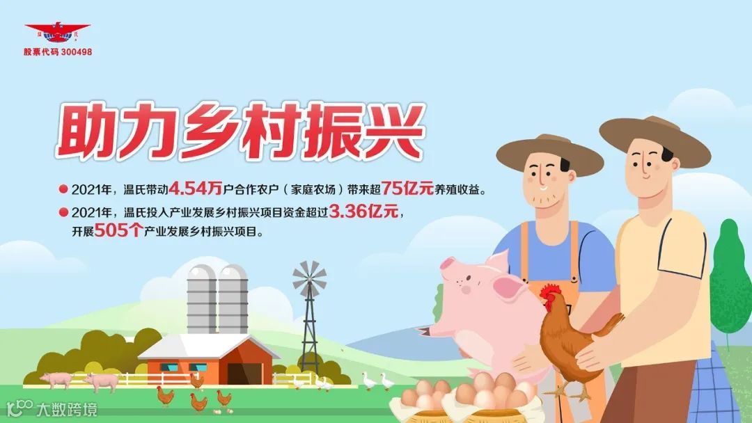 2021 年,温氏投入产业发展乡村振兴项目资金超过 3.36 亿元,其中 3.30亿元投入 505 个产业发展乡村振兴项目。2021年,温氏共为 4.54 万户合作农户(或家庭农场)带来超 75 亿元养殖收益。