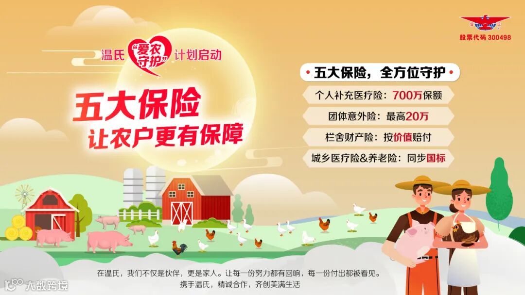 温氏股份推出的“爱农守护”计划,创新地为合作农户定制了人身保险和栏舍保险两大类保险产品,包括医疗保险、养老保险、意外险、补充医疗险、栏舍财产保险等五个险种。