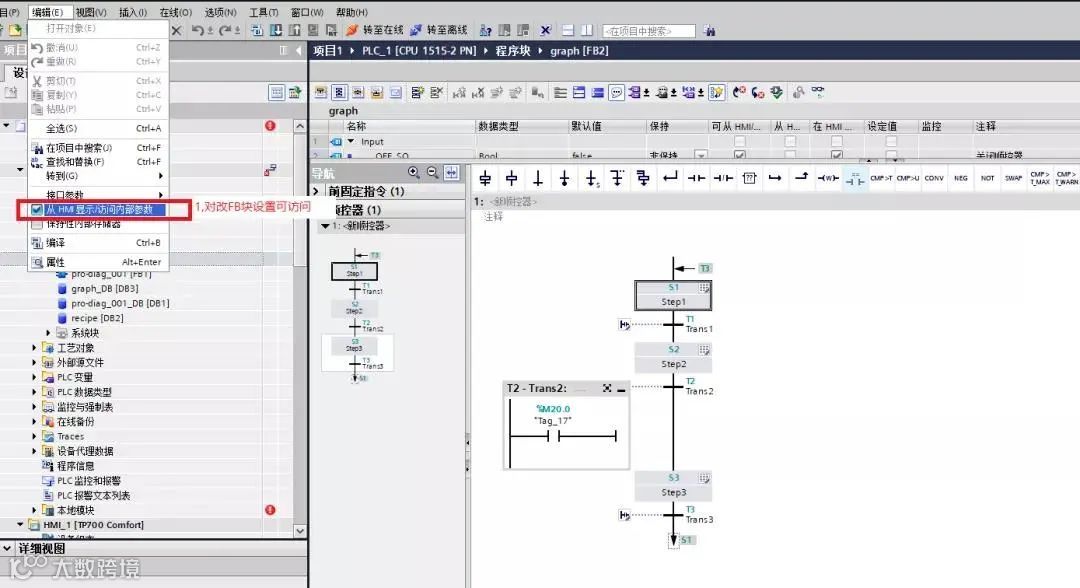 1)首先创建一个Graph 流程的FB块,用FB块进行流程图的编程,打开FB功能块,并在编辑菜单中勾选如图“从HMI显示/访问内部参数”,如下图所示: