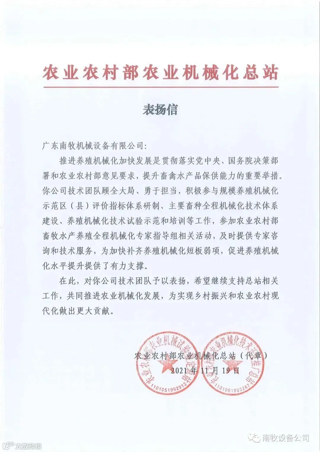近日,广东南牧机械设备有限公司(简称:南牧机械)收到一封来自农业农村部农业机械化总站的表扬信。信中