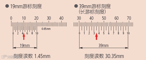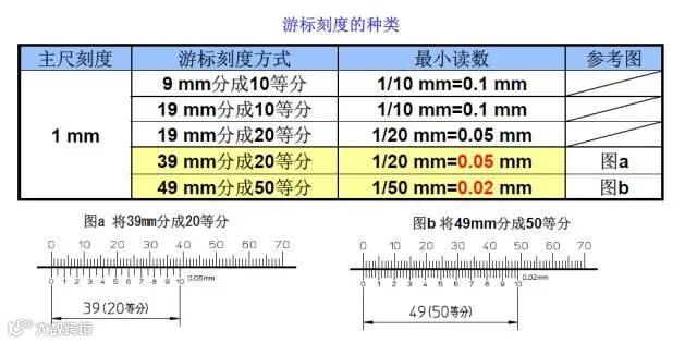早期的卡尺在主尺上有19个分度,游标尺上有20个分度,提供0.05的精度,但是,线与线之间的间隔太近,很难读数、所以自从1970年起,长游标卡尺普遍都使用39个主尺分度,以此来拉大刻度线的间距。