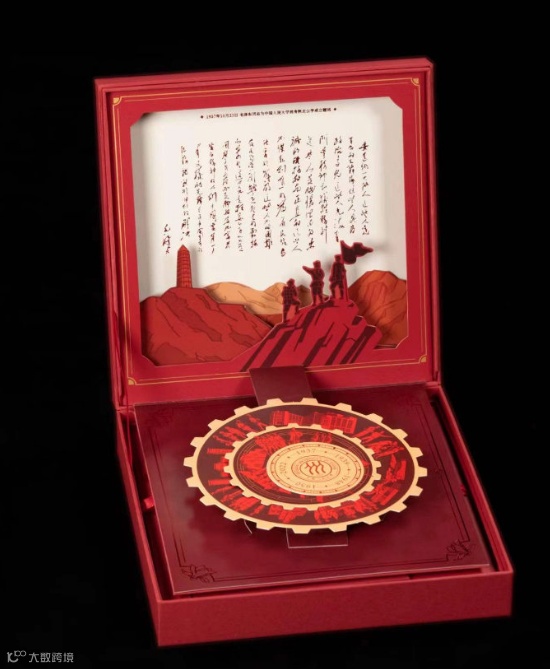 采用函匣立体式设计,以人大红为主色调,内里一共分上下两层:上层主体为立体校史罗盘,打开瞬间庄重感拉满。