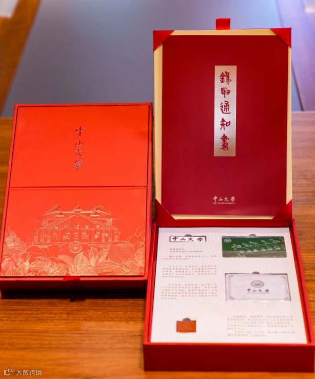 中山大学的录取通知书整体色调以状元红为主,盒内还有云南凤庆县的普洱茶砖!