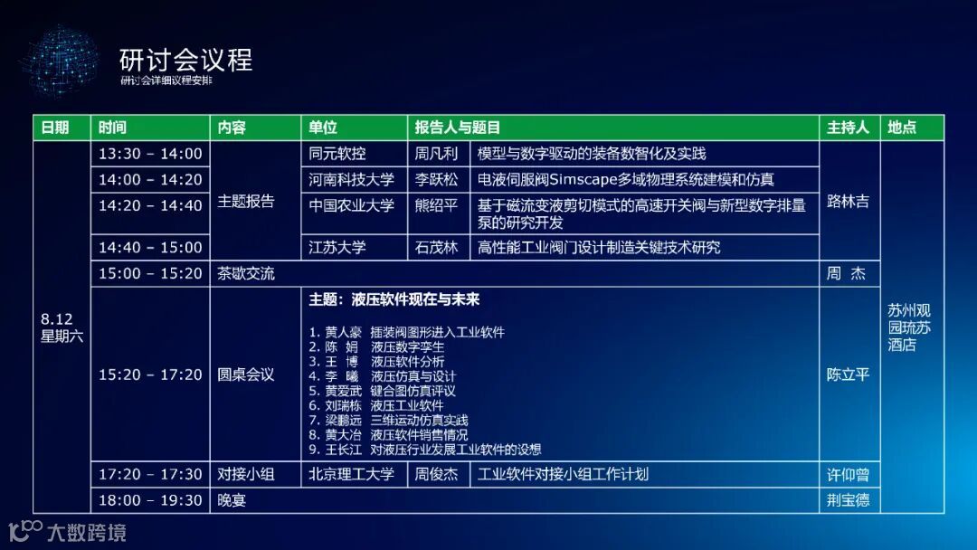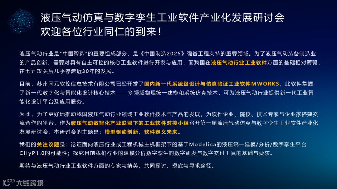 本次研讨会关注议题是:论证面向液压行业或工程机械主机框架下的基于Modelica的液压统一建模/分析/数字孪生平台CHyP1.0的可能性;探究目前我们行业的建模分析数字孪生的数字研发与数字交付工具的基础与要求。