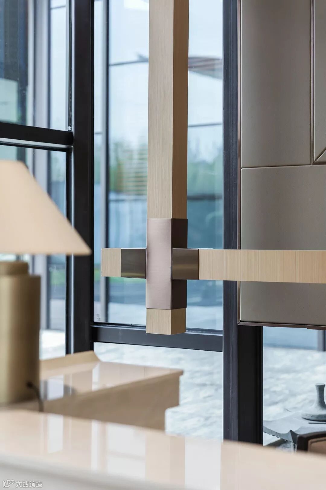 大面积的直线条勾勒出空间意境的氛围。哑金色的台灯,在细节处透露出现代低奢风范。