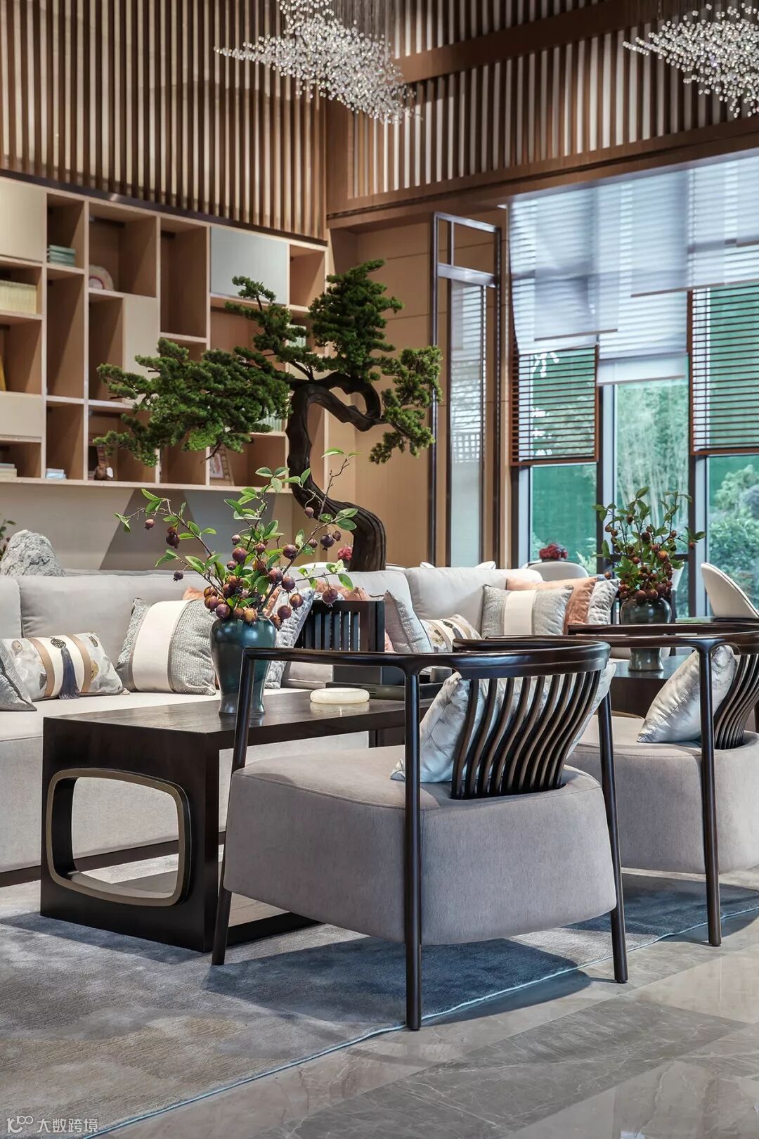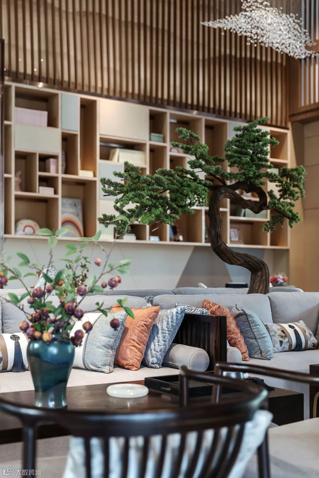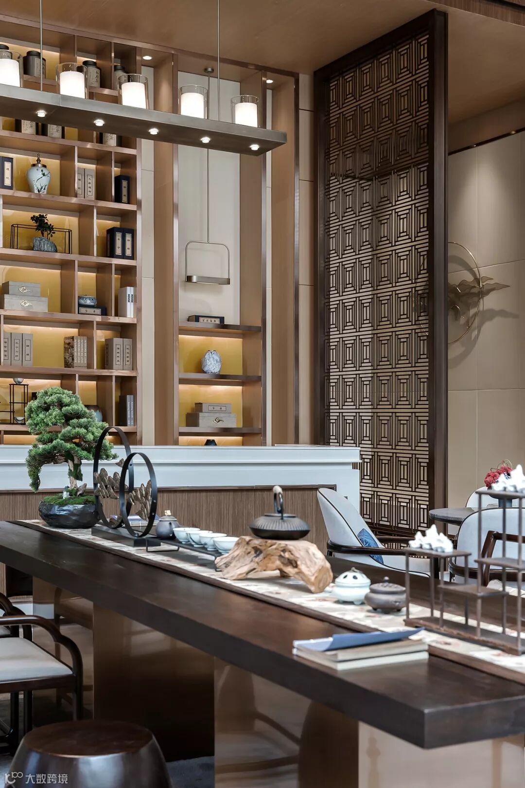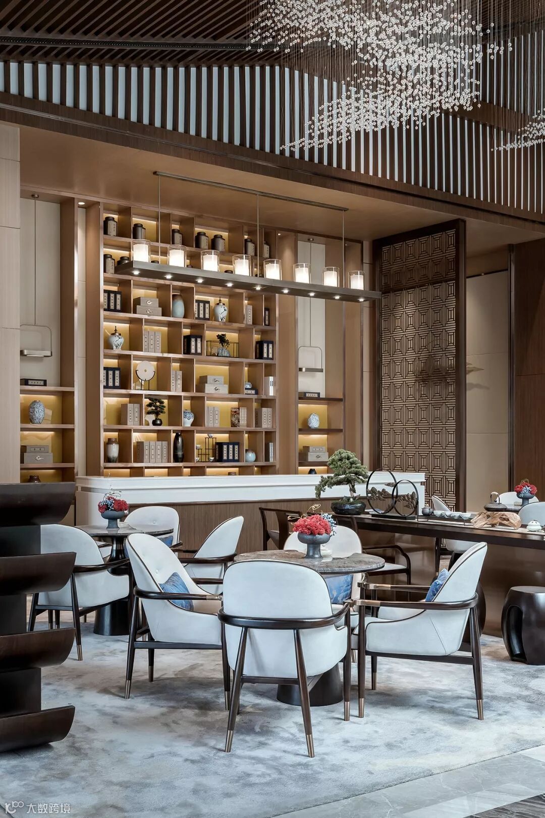 隐约的山形水晶吊灯,以疏密高低层次在空间中勾勒出意境之美,将西式元素现代东方化。以简饰繁,线条明朗,呈现出大道至简、清远悠长的东方气韵。