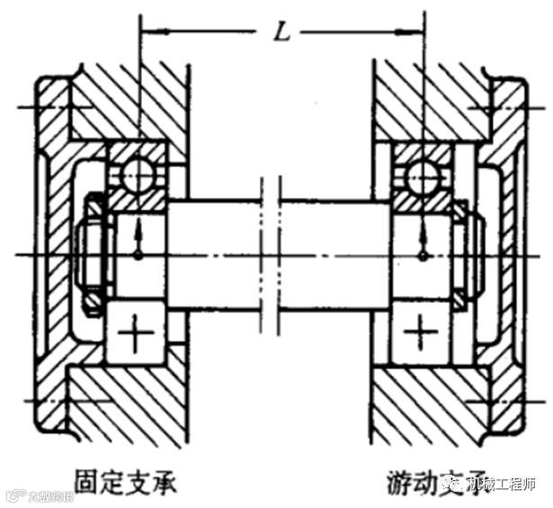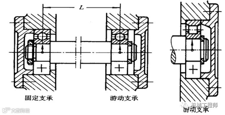 作为固定支撑的轴承,应能承受双向载荷,故此内、外圈都要固定(如左端图)。作为游动支撑的轴承,则其内圈应固定(如右端图)。若使用的是可分离型的圆柱滚子轴承等,则其内、外圈都应固定