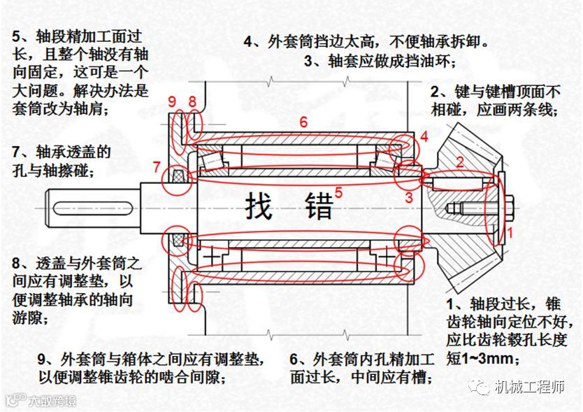 图示锥齿轮轴系的两轴承均安装在套杯3中,增减1处垫片可使套杯相对箱体移动,从而调整轴向位置;