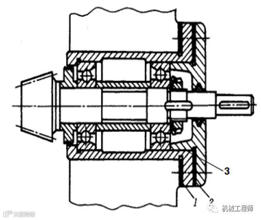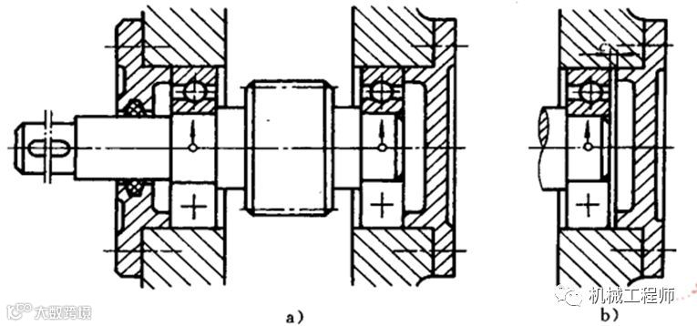 这种安装主要用在两个对成布置的角接触球轴承或圆锥滚子轴承的情况,同时考虑温度升高后轴的伸长,为使轴的伸长不致引起附加应力,在轴承盖与外圈端面之间留出热补偿间隙c=0.2~0.4mm(如图b)。