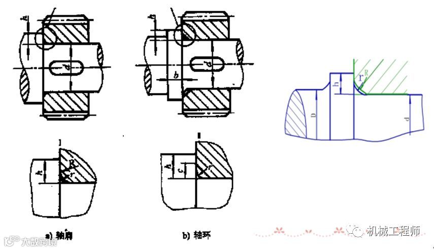 注意要点:为了保证零件与定位面靠紧,轴上过渡圆角半径应小于零件圆角半径或倒角,一般定位高度取为(0.07~0.1)d ,轴环宽度b = 1.4h 。