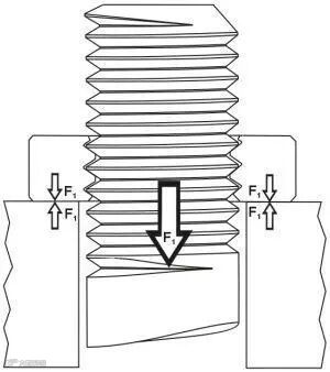 由于牙形的角度改变,使施加在螺纹间接触所产生的法向力与螺栓轴成60度角,而不是像普通螺纹那样的30度角。显然30°楔形螺纹法向压力远远大于扣紧压力,因此,所产生的防松摩擦力也就必然大大增加了。