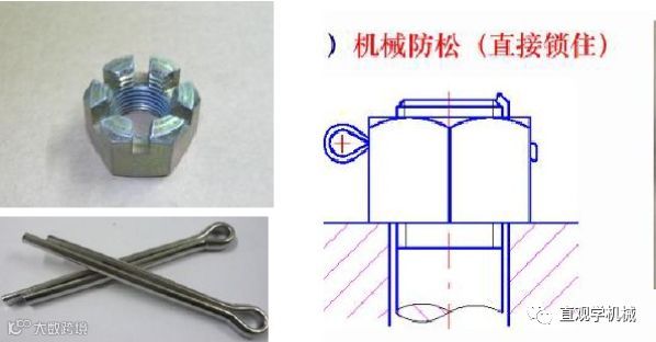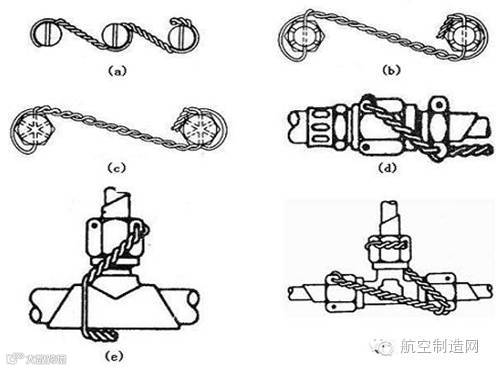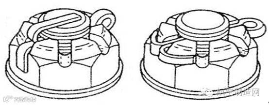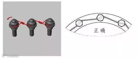 串联钢丝防松是将钢丝穿入螺栓头部的孔内,将各螺栓串联起来,起到相互牵制的作用。这种放松方式非常可靠,但拆卸比较麻烦。