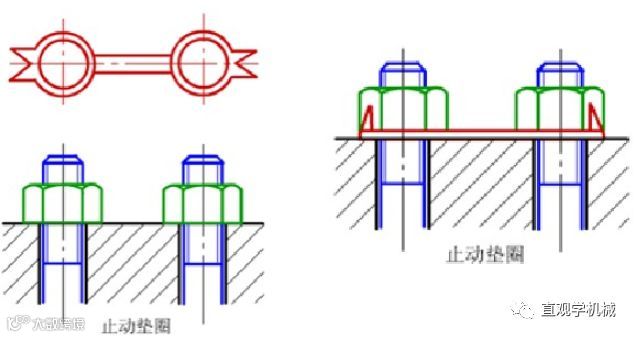 螺母拧紧后,将单耳或双耳止动垫圈分别向螺母和连接件的侧面折弯贴紧,即可将螺母锁住。若两个螺栓需要双联锁紧时,可采用双联制动垫圈,是两个螺母相互制动。