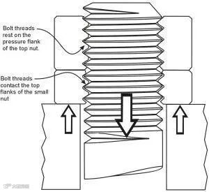 第一螺母(图中右旋)会产生松退趋势,即螺母向左旋转。但是第二螺母(图中左旋)的旋向与第一螺母的旋向相反,因此第一螺母的松退力直接转换成第二螺母的拧紧力。这样,螺母万万不会松退。