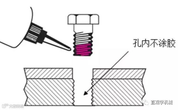 对于盲孔工况:将锁固胶滴至盲孔底部,再将锁固胶涂到螺栓的螺纹上,装配并上紧至规定力矩;如盲孔开口向下,则只需将锁固胶涂在螺栓的螺纹上即可,盲孔内不需涂胶。
