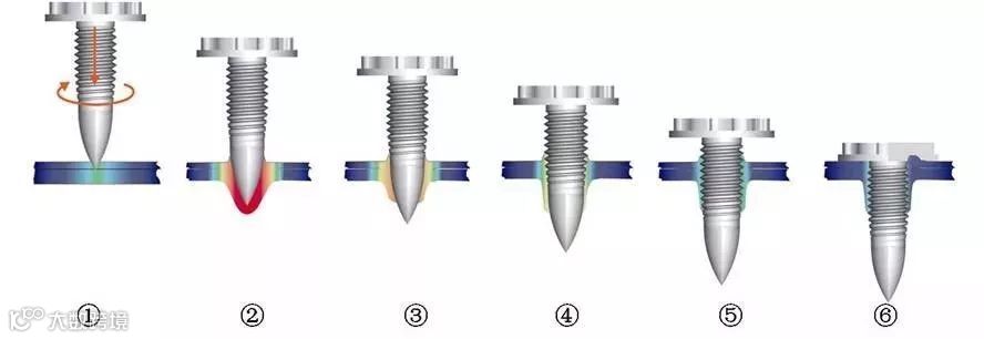 热融紧固连接工艺步骤与过程包括六个阶段:旋转(加热)→穿透→通孔→攻螺纹→拧螺纹→紧固。