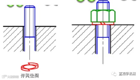 同时弹簧垫圈的开口处的尖角分别嵌入螺栓和被连接件表面,从而防止螺栓相对于被连接件回转。