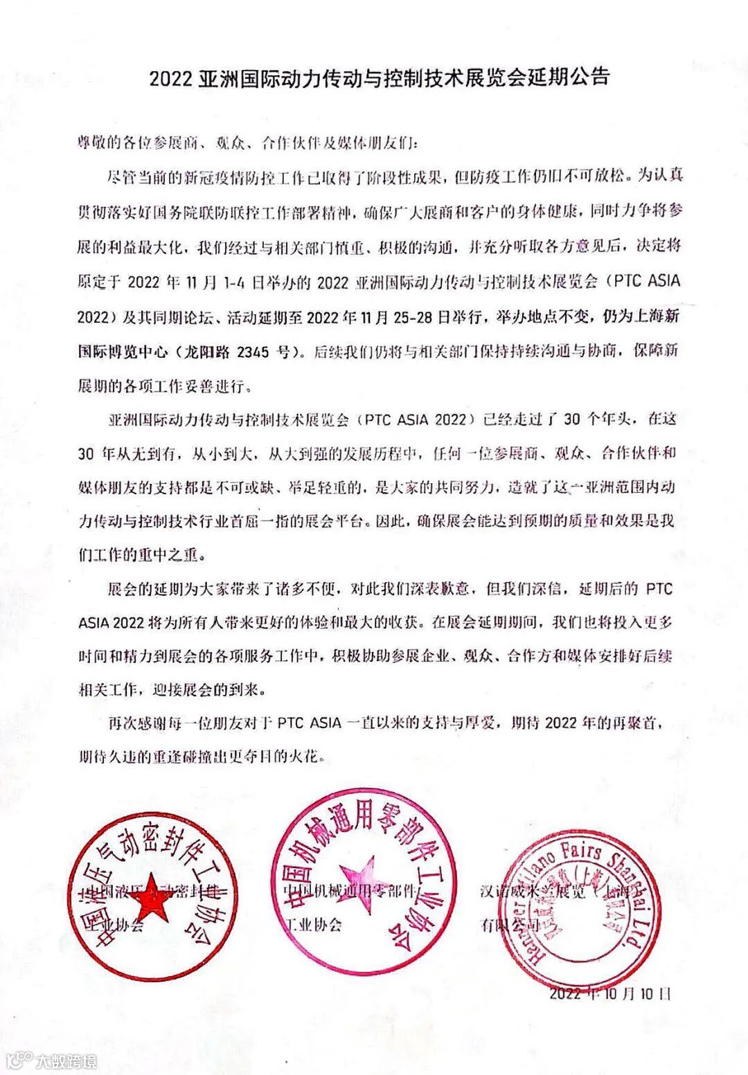 为认真贯彻落实好国务院联防联控工作部署精神,确保广大展商和客户的身体健康,我们经过与相关部门慎重、积极的沟通,并充分听取各方意见后,决定将原定于2022年11月1-4日举办的2022亚洲国际动力传动与控制技术展览会( PTC ASIA 2022 )及同期论坛、活动延期至2022年11月25-28日举行,举办地点不变,仍为上海新国际博览中心(龙阳路2345号)。后续我们仍将与相关部门保持持续沟通与协商,保障新展期的各项工作妥善进行。