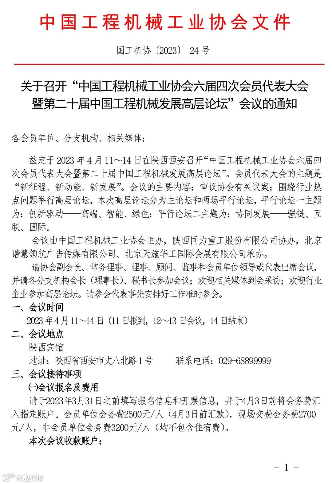 兹定于2023年4月11~14日在陕西西安召开“中国工程机械工业协会六届四次会员代表大会暨第二十届中国工程机械发展高层论坛”。会员代表大会的主题是“新征程、新动能、新发展”。会议的主要内容:审议协会有关议案;围绕行业热点问题举行高层论坛,本次高层论坛分为主论坛和两场平行论坛,平行论坛一主题为:创新驱动——高端、智能、绿色;平行论坛二主题为:协同发展——强链、互联、国际。