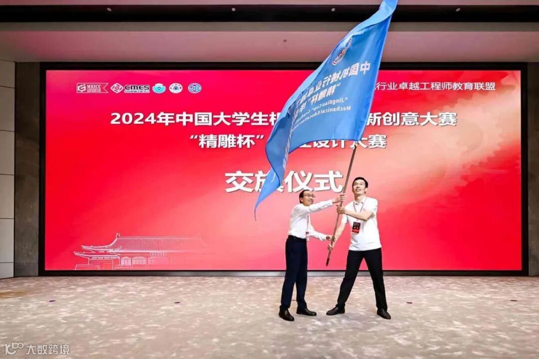 颁奖环节后,浙江大学机械工程学院副院长刘振宇与广东工业大学机电工程学院副院长胡兆勇进行赛旗交接,下一届“精雕杯”毕业设计大赛将在广东工业大学举办,届时欢迎各高校、企业积极参与,延续比赛影响力与凝聚力。