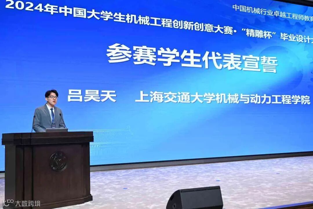 参赛学生代表、上海交通大学机械与动力工程学院本科生吕昊天进行宣誓。他表示,每位参赛选手都将用严谨的态度和追求卓越的精神,全力以赴、突破常规,展示新时代大学生风采。