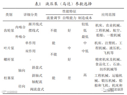 对于不同类型的液压泵(马达),其流量调节、自吸能力、制造成本等参数也有所不同,如表1所示。