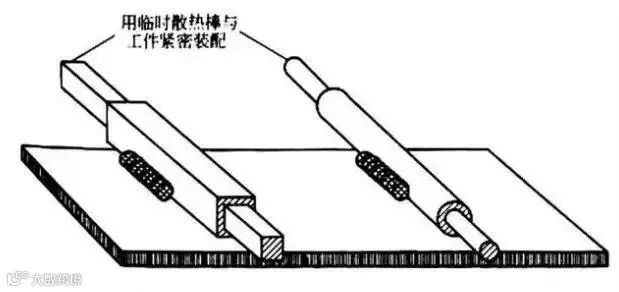 有,主要是在焊接过程中采用一个散热棒。如将一个实心圆棒插入薄壁圆管中,或将一实心矩形棒插入矩形管件中,实心棒将会带走薄壁工件的热量并防止烧穿。一般来说,在多数供货的中空管或矩形管材料中都紧密安装了实心圆棒或矩形棒。焊接时应注意将焊缝远离管子的末端,管子的末端是最易发生烧穿的薄弱区域。用内置散热棒避免烧穿的示意如图1所示。