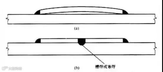 解决方法是在加强板中间部位采用塞焊或槽焊,将加强板表面与基板表面贴紧,消除变形以利于进行机械加工。采用塞焊或槽焊方法定位加强板示意如图8(b)所示。