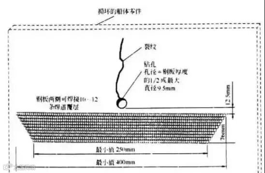 解决方法首先在裂纹末端钻一个小孔,以利于在较大的范围内分散末端的应力,然后焊接一系列长度不等的多道焊缝,增加裂纹前端钢板的强度。