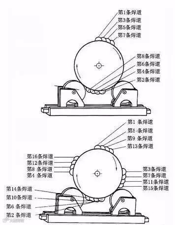 ② 先在曲轴下部堆焊一条焊道,然后旋转曲轴180°堆焊下一条焊道,这样可以平衡焊接应力,并可显著消除焊接热变形。应注意的是,在第一条焊道上进行顺序堆焊将会引起曲轴翘曲。该堆焊工艺适合于对滚轮曲轴进行修复和焊补。