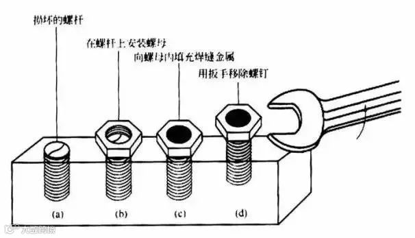 ② 如果螺钉槽、螺母或牙槽损坏或丢失,可以在螺钉头的上部(或残余部分)放置一个螺母,旋紧螺母,然后采用任何焊接方法在螺母和螺钉的内部填充金属。这样就会将螺母和螺钉残余部分连接起来,然后在螺母上放置扳手或牙钳,迅速拔出螺钉。采用这种方法有利于提供一个新的握力点并可利用热量使螺钉紧固,用焊接方法移除固定螺钉的残余部分示意如图4所示。