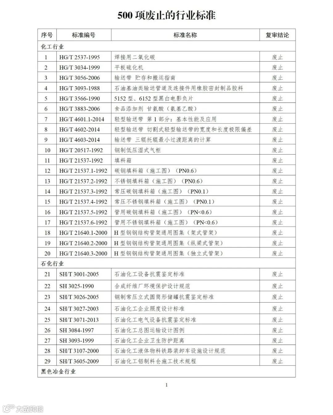 为做好工业和信息化领域行业标准维护工作,提高行业标准的科学性、适用性和有效性,经对化工、石化、黑色冶金、有色金属、建材、稀土、机械、汽车、船舶、航空、轻工、纺织、兵工民品、电子、通信等15个行业4156项行业标准开展复审,《橡胶机械噪声声压级的测定》等2405项行业标准继续有效(附件1),《搪玻璃温度计套》等1251项行业标准修订(附件2),《焊接用二氧化碳》等500项行业标准自本公告发布之日起废止(附件3)。