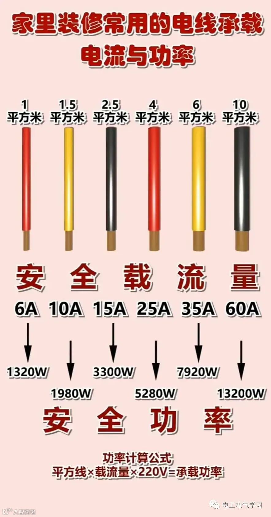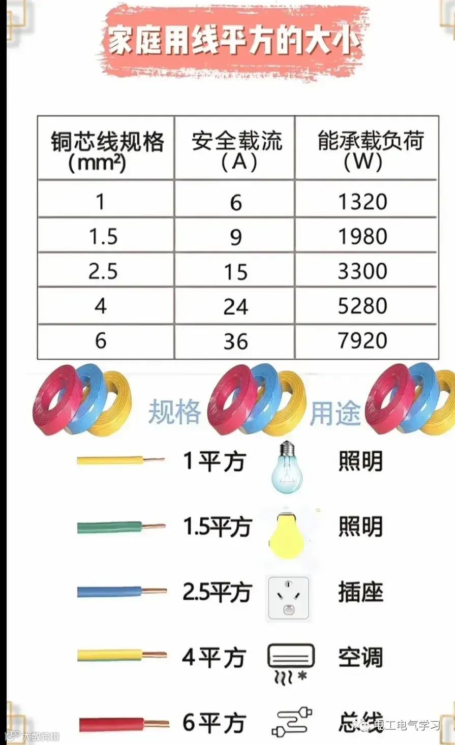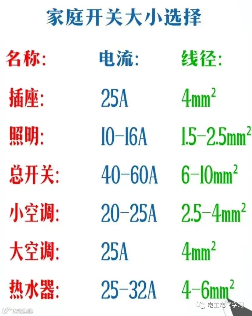 6、家庭装修常用的电缆承载电流与功率