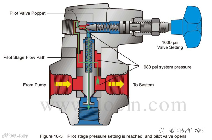 先导级压力达到设置值时,先导阀打开。