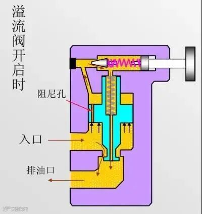 1 、溢流阀入口压力不断增大,当油压力大于先导阀芯设定的压力时,先导阀芯打开。主阀上腔的压力油通过先导阀排走,上腔压力变为0。