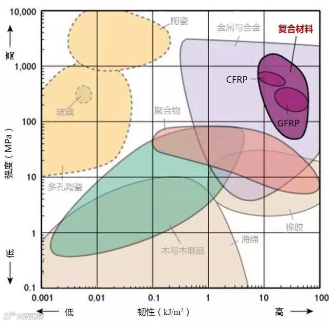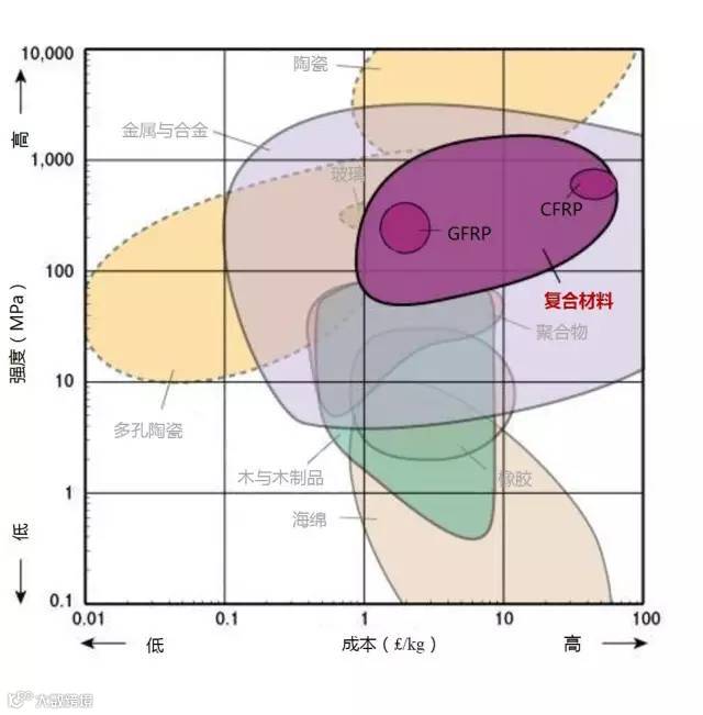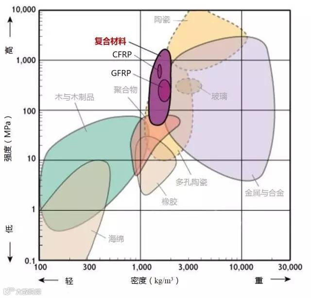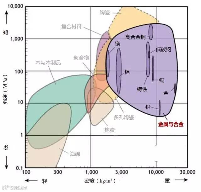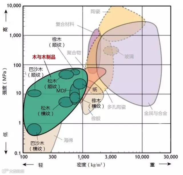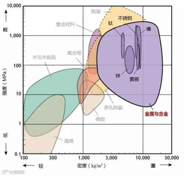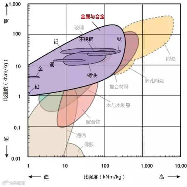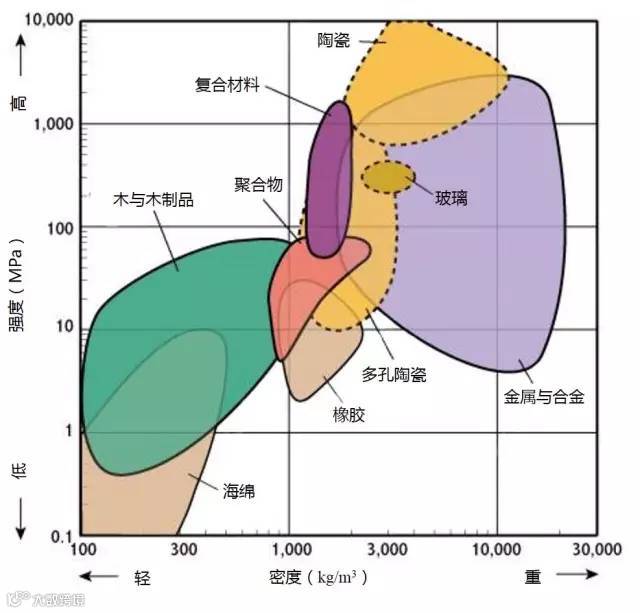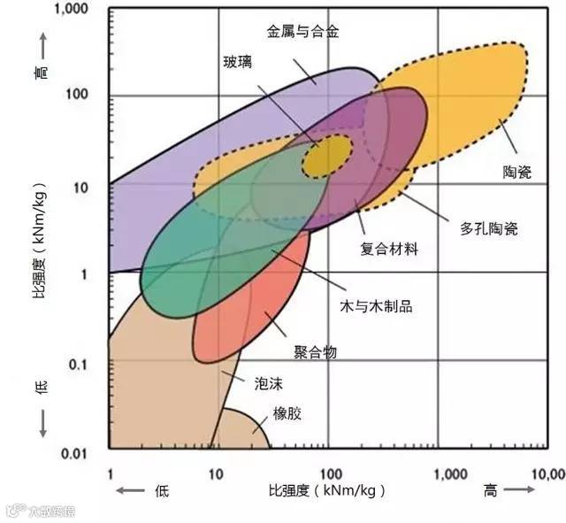 2、高强度且低密度的材料位于图形的左上部分。