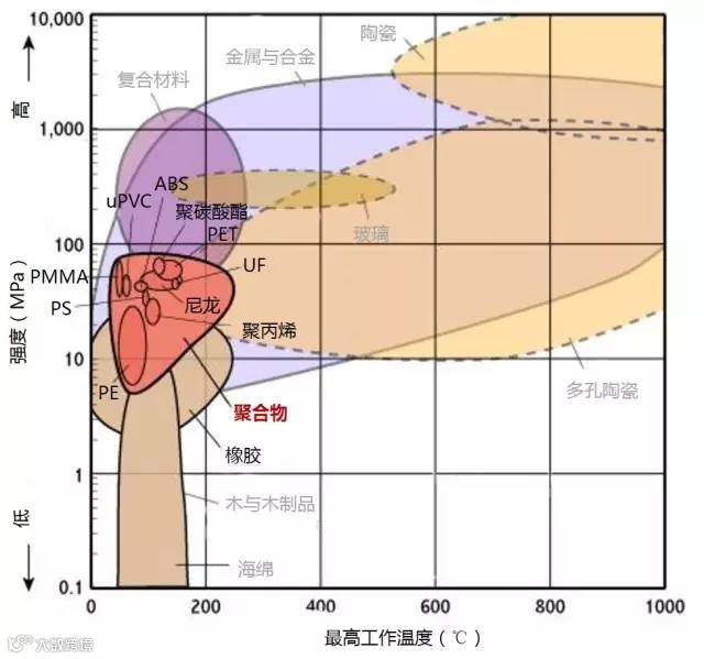 2、聚合物的最高工作温度较低,金属的最高工作温度居中,陶瓷能够承受非常高的温度。热塑性聚合物的最高工作温度低于热固性聚合物。