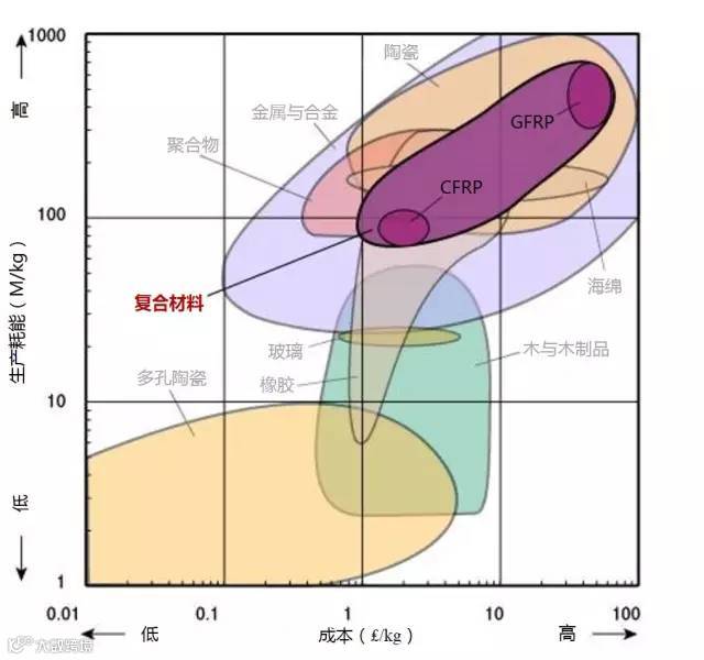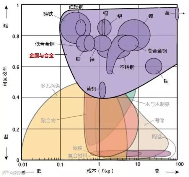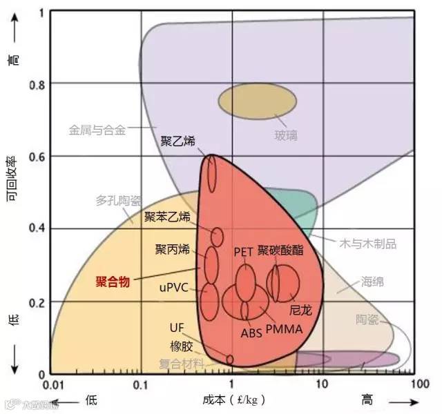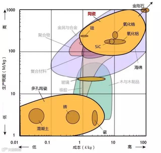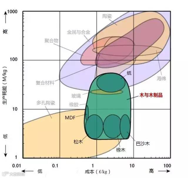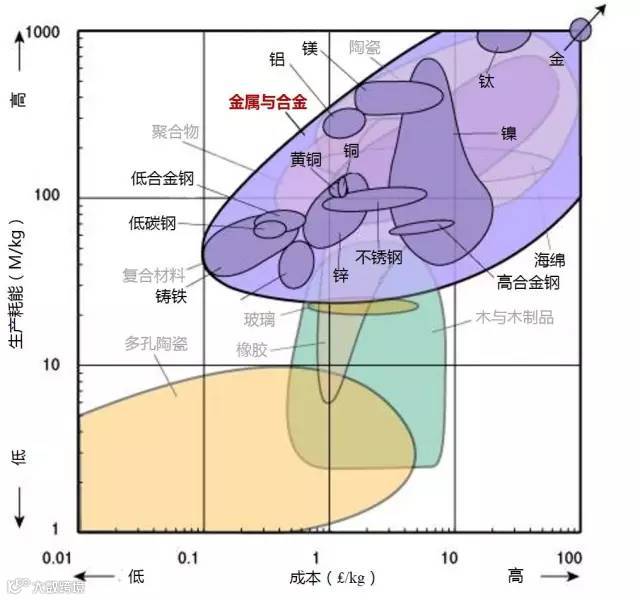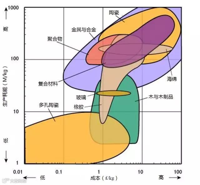1、生产某种材料所需消耗多大的能量是原料成本的一个因素。所以是大部分材料都位于左下角(低成本/低能耗)或右上(高成本/高能耗)。