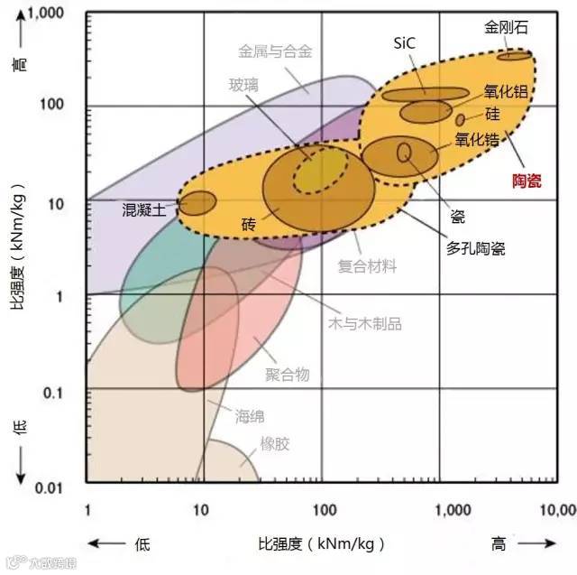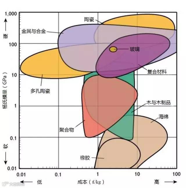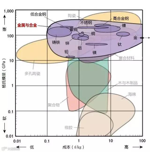 3、需要廉价且坚硬的材料,则选择图表左上方的材料,大多为金属和陶瓷。