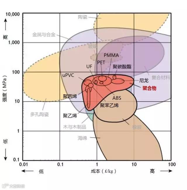 2、许多应用要求材料具有较高的强度,如螺丝刀、安全带等,但是他们通常都比较贵,只有极少数的材料能同时满足强度和成本的要求(左上部分)。