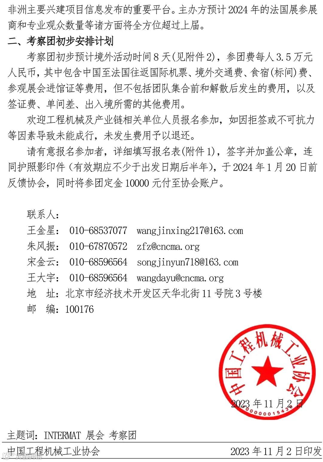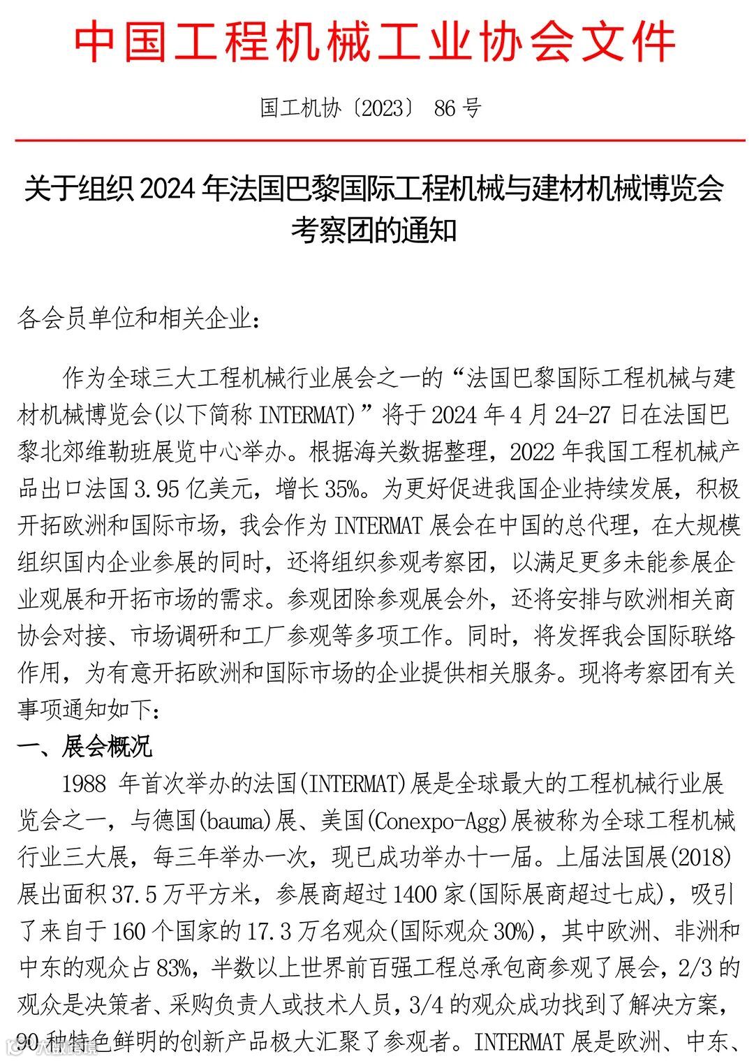 作为全球三大工程机械行业展会之一的“法国巴黎国际工程机械与建材机械博览会(以下简称INTERMAT)”将于2024年4月24-27日在法国巴黎北郊维勒班展览中心举办。根据海关数据整理,2022年我国工程机械产品出口法国3.95亿美元,增长35%。为更好促进我国企业持续发展,积极开拓欧洲和国际市场,我会作为INTERMAT展会在中国的总代理,在大规模组织国内企业参展的同时,还将组织参观考察团,以满足更多未能参展企业观展和开拓市场的需求。参观团除参观展会外,还将安排与欧洲相关商协会对接、市场调研和工厂参观等多项工作。同时,将发挥我会国际联络作用,为有意开拓欧洲和国际市场的企业提供相关服务。现将考察团有关事项通知如下:
